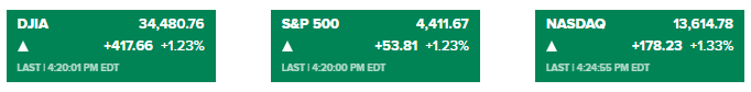 美股三大指数低开高走:道琼斯指数收盘上涨417.66点,至34480.76点,涨幅1.23%;标准普尔500指数上涨1.23%,至4411.67点;纳斯达克综合指数上涨1.33%,至13614.78点。