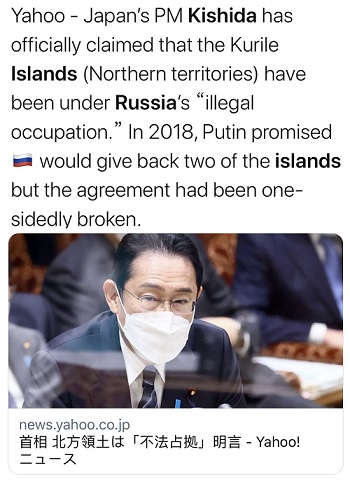 据日本媒体报道,日本为了推动和俄罗斯签订和平条约,一直都没有使用“日本固有领土”与“非法占领”等敏感表述,但俄罗斯入侵乌克兰后,岸田文雄便重新使用“日本固有领土”的说法。