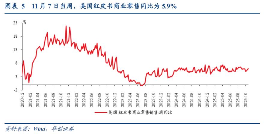 美国红皮书商业零售同比增速小幅反弹,中枢持稳。11月7日当周,美国红皮书商业零售同比为5.9%,四周移动平均为5.45%;前一周为5.7%,四周移动平均为5.45%。