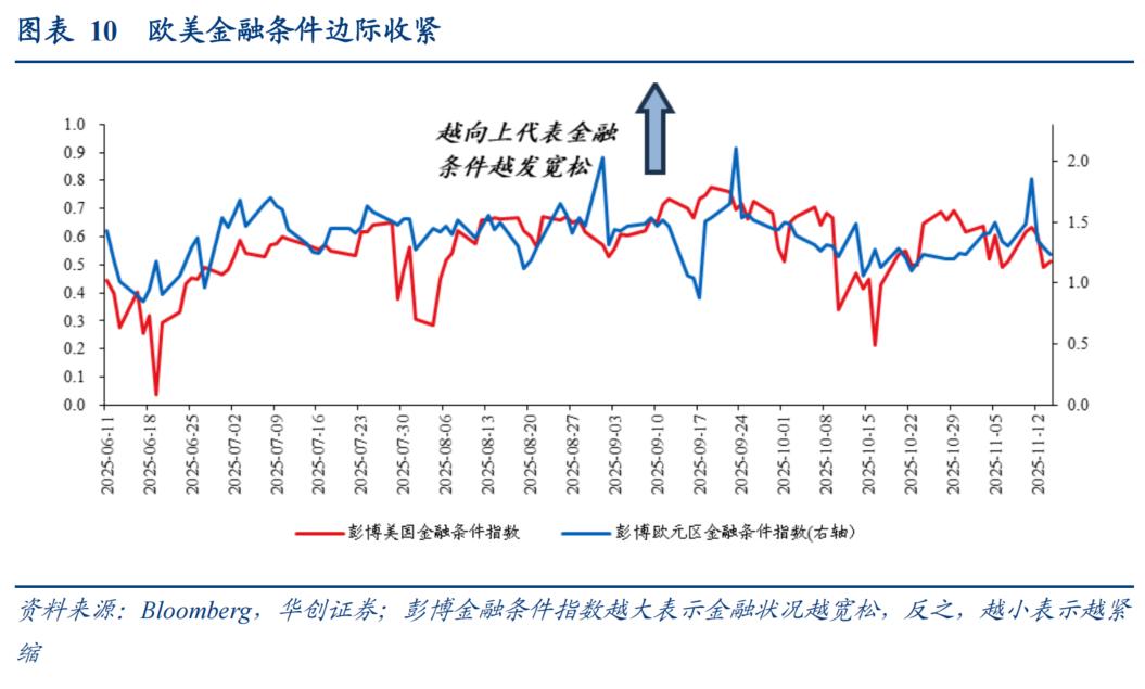 欧美金融条件边际收紧。11月14日,美国彭博金融条件指数为0.511,一周前为0.514,两周前为0.616。11月14日,欧元区彭博金融条件指数为1.237,一周前为1.3,两周前为1.235。