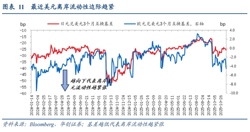 最近美元离岸流动性边际趋紧。11月14日,日元兑美元3个月互换基差为-25.8bp,一周前为-24.3bp,两周前为-24.6bp。11月14日,欧元兑美元3个月互换基差为-4.5bp,一周前为-2.6bp,两周前为-2.8bp。