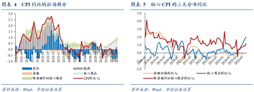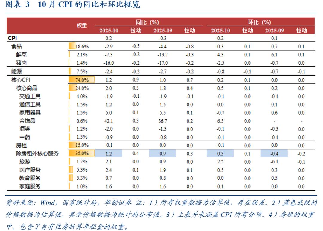 核心CPI中,核心商品同比从1.8%升至2%,涨幅连续第6个月扩大,“其中金饰品和铂金饰品价格分别上涨50.3%和46.1%;扩内需等政策效应继续显现,家用器具、文娱耐用消费品和家庭日用杂品价格涨幅在2.4%—5.0%之间,燃油小汽车价格降幅收窄至2.3%”。房租同比从0%下行至-0.1%。预计不含房租的核心服务价格同比从0.9升至1.2%,其中,“飞机票和宾馆住宿价格分别上涨8.9%和2.8%;医疗服务和家政服务价格分别上涨2.4%和2.3%”。