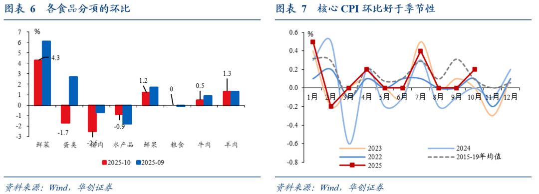 第一,食品价格明显好于高频价的拟合。从高频批发价推算,10月食品价格应下跌0.4%,但实际上涨0.3%,对CPI的拉动,里外相差了约0.13个百分点。差异较大的是:1)猪肉批发价环比-8.1%,CPI猪肉环比-2.5%;2)鸡蛋批发价环比-7.5%,CPI蛋类环比-1.7%。生猪和鸡蛋都是供给压力较大的品种,可能受节假日消费需求增长、中间环节利润调节和价格传导滞后的影响,批发价与零售价的差异较大,但从历史经验来看,这种短期分化较难持续。