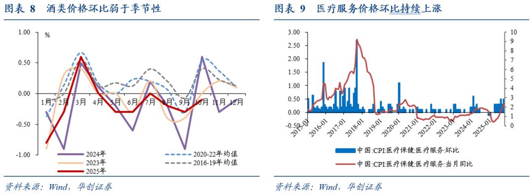 Ø 核心商品价格涨幅从0.5%收窄至0.3%,耐用品中,汽车、家电和手机等价格改善继续放缓,但金饰品价格继续大涨;酒、衣着、药品等非耐用品价格表现均偏弱。耐用品中,交通工具价格下跌0.1%,跌幅与上月相同,弱于过去五年同期均值的0%;家用器具价格从上涨0.6%转为下跌0.7%,弱于过去五年同期均值的0.2%;通信工具价格从上涨0.1%转为持平,好于过去五年同期均值的-0.1%;受国际金价上涨影响,国内金饰品价格上涨10.2%。非耐用品中,酒类价格下跌0.1%,明显弱于季节性表现;衣着价格持平,表现弱于季节性;中药和西药价格均下跌0.1%。
