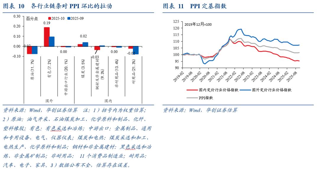 PPI环比上涨,一方面是海外输入性因素的影响,对PPI的拉动约0.11个百分点。铜、金上涨带动的有色金属相关行业价格上涨,国际油价下跌拖累原油相关行业,综合来看,输入性因素仍是拉动。另一方面是国内产能治理持续推进带动的供需改善,主要体现为煤炭和部分中游行业。只考虑计算机电子行业价格环比转正、汽车制造业环比降幅收窄,对PPI的拖累就较上月减少约0.06个百分点。