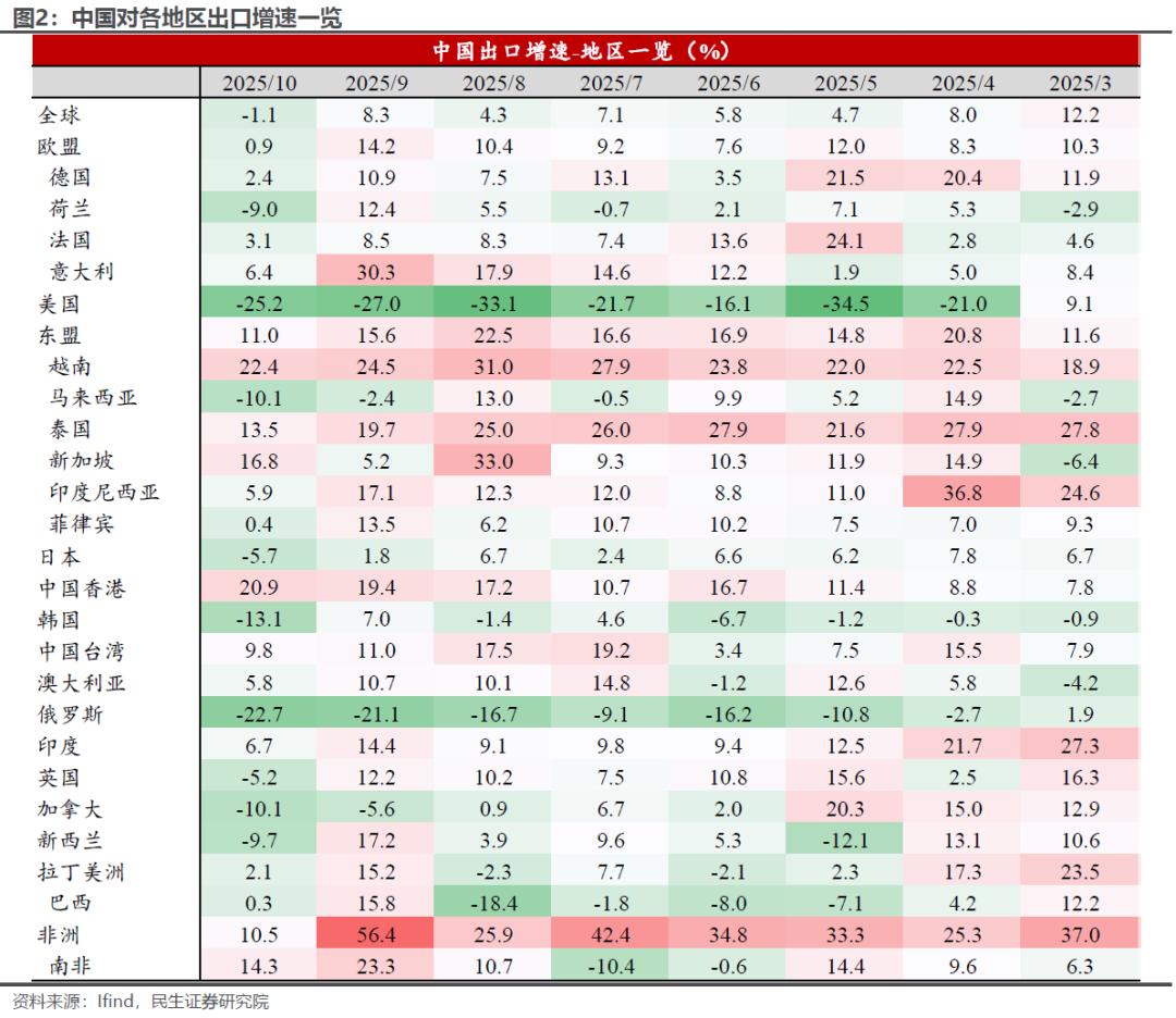 国别上,虽然多数区域出口增速回落,但新兴市场依然强劲。一方面,以东盟、中国香港等为代表的转口贸易“跳板”仍然强劲,显著对冲对美出口增速的下滑;