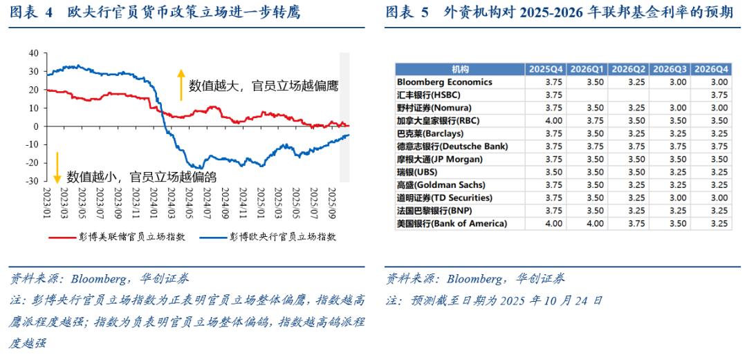 欧元区降息预期持续偏弱。12月会议降息概率维持在10%上下,10月下旬以来降息概率进一步下降至5%左右,年内欧央行降息概率极小。而从中期来看,市场对2026年6月欧央行降息的预期也不强,目前对明年6月基准利率的预期值为1.8%左右,对应截至明年年中也不再降息。而从“央行官员货币政策立场指数”来看,10月以来欧央行官员货币政策立场也在不断转鹰。