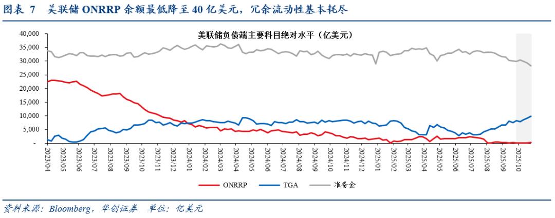 截至2025年10月29日,美联储准备金规模降低至2.83万亿美元,美联储总资产6.64万亿美元;ONRRP余额大幅收缩至195亿美元、用量已几乎耗尽;同时10月TGA账户余额进一步从9月末的7580亿美元提升至10月末的约9840亿美元,也加速了准备金余额的消耗速度。目前准备金余额/名义GDP比重约12%(按2025年上半年名义GDP年化值计算),大致符合美联储对缩表终点的估算值(即合意准备金余额/名义GDP比重约为10%~12%,详见《美联储停止缩表的五节点与三阶段——美国风险探测仪系列五》),目前美联储冗余流动性基本耗尽。
