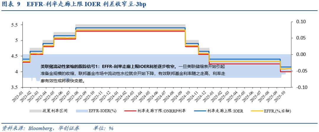 指标1:EFFR-利率走廊上限IOER利差是否逐步收窄?在正常的利率走廊运行机制下,有效联邦基金利率EFFR运行于利率走廊区间中枢,而一旦美联储缩表开始引起准备金规模的收缩,联邦基金市场中流动性水位就会开始下降,有效联邦基金利率随之走高,EFFR与利率走廊上限IOER的利差就会出现收窄。9月下旬以来,该利差从稳定在-7bp逐步收窄至最低-3bp,缩表带来的流动性收紧已显著体现。