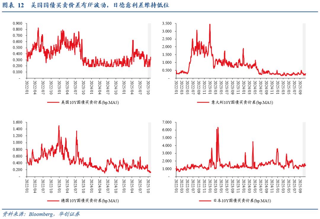 美国国债买卖价差有所波动,未显著走高,日德意利差维持低位。10月美国10Y国债买卖价差保持在0.19bp-0.39bp之间波动,美债市场并没有因缩表尾声流动性收紧而出现利差大幅走阔。同时,日德意国债利差持续维持低位,全球国债市场流动性整体宽松。