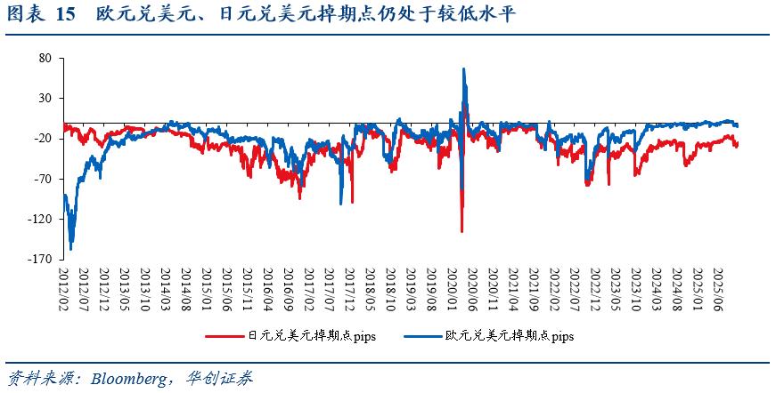 离岸美元掉期点:近期欧元兑美元、日元兑美元掉期点保持在较低水平,离岸美元市场流动性仍然充裕,并没有受到美国国内流动性收紧的冲击。