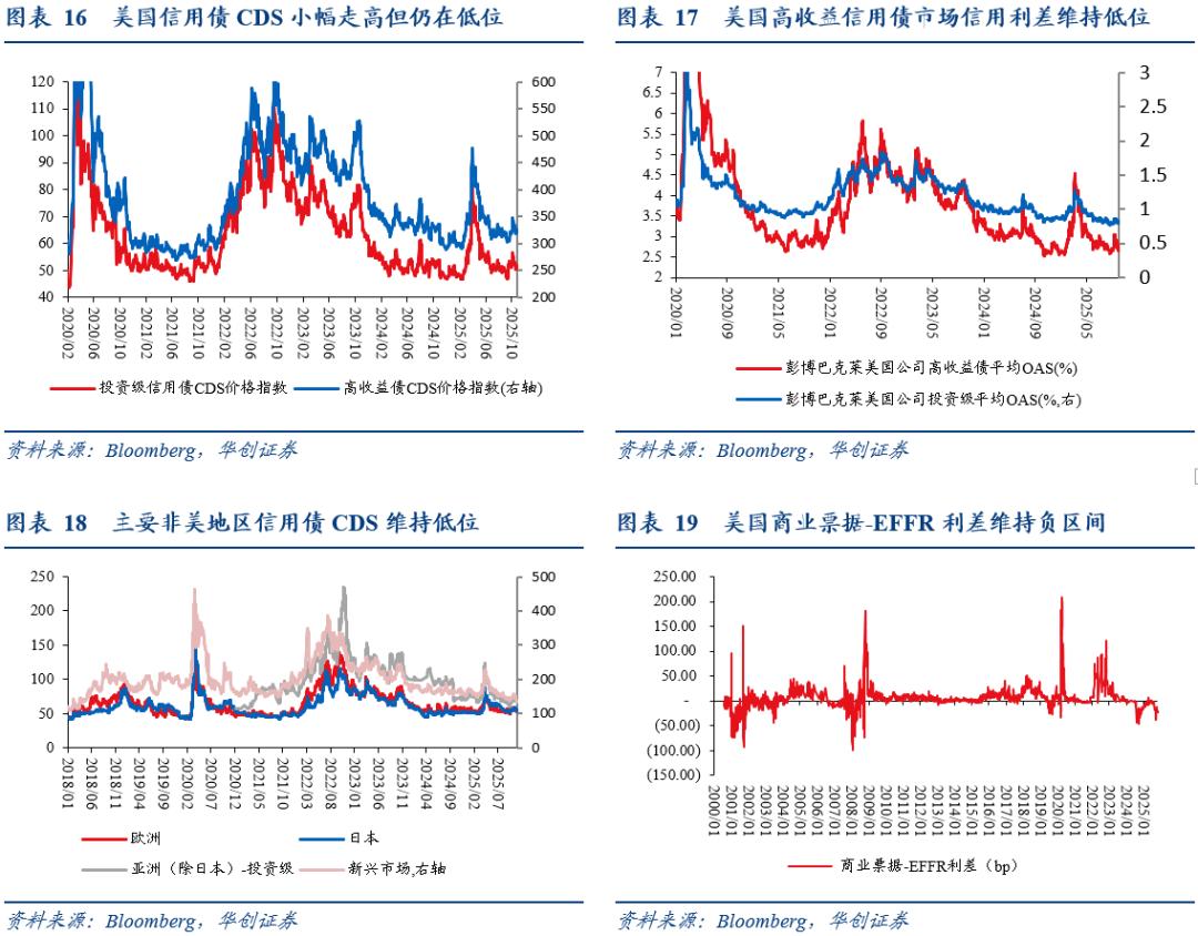 2025年10月以来美国投资级信用债CDS价格有小幅走高但仍在低位;同时信用债OAS、高收益债CDS价格均维持低位。尽管10月美国出现了地区性银行的“信贷危机”事件,不过从信用风险溢价指标来看,对市场冲击有限,信用债市场依然稳定。欧洲、日本、亚洲(除日本)的信用债CDS价格维持低位、美国商业票据-EFFR利差10月以来维持负区间。